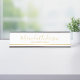 Professional White and Gold Desk Nameplate featuring name in gold modern script font style and profession in gold modern sans serif font style, with bottom gold border, on white background.