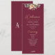 Burgundy coloured program for weddings, with watercolor flowers and garden foliage. A simple yet elegant contemporary botanical design inspired by boho vintage style, with monogram on the back.