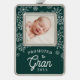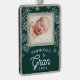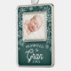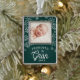 Celebrate his first Christmas as a grandmother with this sweet photo ornament featuring a baby photo framed by falling white snowflakes on a forest green background. "Promoted to Gran" appears beneath in white rustic lettering, along with the year.