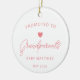 A fun and creative way to make it official that you're expecting a bundle of joy! This ceramic Christmas ornament will become a beloved keepsake that decorates the Christmas tree for years to come. It features the phrase "Promoted to Grandparents" in a trendy script pairing. The baby's name and due date follow. A small heart separates the text. All of the text is customisable so you can edit it to match your family. The text and heart are girly pink, but you can change the colour to anything you wish.