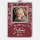 Celebrate his first Christmas as a grandmother with this sweet photo ornament featuring a baby photo framed by falling white snowflakes on a red background. "Promoted to Mimi" appears beneath in white rustic lettering, along with the year.