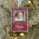 Celebrate his first Christmas as a grandmother with this sweet photo ornament featuring a baby photo framed by falling white snowflakes on a red background. "Promoted to Nanni" appears beneath in white rustic lettering, along with the year.