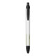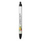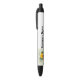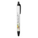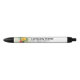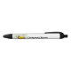 Promotional marketing ink pen with logo template and text. Add your company logo to the square template. Black printed text is larger for the business name. Also add more information, such as a website, office location, or contact number under the name. This retractable pen is black and white.