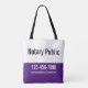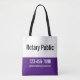 A business tote bag makes it easy to promote your notary public business while you're on the go. You can edit the text to add a business name (if desired), your phone number, and an email address. All text can be edited or deleted. The magnet's top half is white with black text. The bottom part is royal purple with white text.