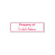 This self-inking stamp is a text template that you can edit to show a custom message. Currently, the top line of the display text says Property of. The bottom line is for the name (Shown: Property of Elizabeth Anderson). The name appears in a cute handwriting style font. A border appears around the text. The stamp is perfect for stamping books and other belongings a child takes to school.