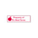 This self-inking stamp is a text template that you can edit to show a custom message. Currently, the top line of the display text says Property of. The bottom line is for the teacher's name (Shown: Mrs. Johnson's Classroom). An apple is next to the text.