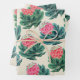 This is a vintage pattern of pink protea flowers with green leaves on a light beige background.