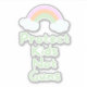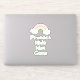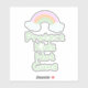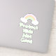 Vinyl decal with "Protect Kids Not Guns" text in mint green handwriting style font and pastel rainbow graphic on purple background.