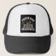This is a graduation announcement design with a black background featuring a black and white graduation cap with a white tassel at the side. The text PROUD DAD is at the top in white varsity-style lettering, followed by of a in smaller script and 2025 in large gold glitter textured numbers. The word GRADUATE appears at the bottom in white varsity-style lettering. The design is decorated with starburst rays emanating from the centre and gold stars throughout. The text 2025 is the focal point of the design. The overall design has a festive, celebratory feel with a black, white and gold colour scheme. The hat is adjustable from 17" to 24". There is a 100% polyester foam front. The 100% nylon mesh back keeps you cool.