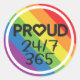 Proud everyday round stickers with the caption "Proud 24/7 365" in black fonts on a rainbow-striped background