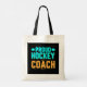 Hockey coach tote bag with aqua blue and gold text reads Proud Hockey Coach.