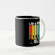 Proud Hockey Dad mug features several colours of green, off white, yellow, and rust orange on a black background with white text that reads I Am a Proud Hockey Dad!
