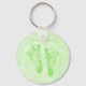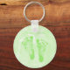 A proud parent announcement keychain with cute green footprints against a soft pastel green background. Personalise by adding your baby's name to the customisable text that says: Proud Parent. Perfect for a baby shower.