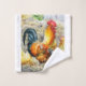 A barnyard rooster framed by a bevy of his lady hens and hay in soft focus around him. The gentle yellows and greys bring the colourful rooster into the centre of attention, right where the proud bird likes to be. This is a mixed media drawing in oil pastel and coloured pencil. By Amanda Diehl, Paxdomino Designs