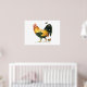 He is colourful in golds, oranges and greens. There’s a monarch butterfly flying above him, and sitting quietly in the background is a little brown hen with three small yellow chickens.