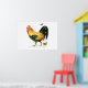 A proud Rooster strutting his stuff with a hen and chickens in the background.