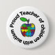 Button with white background with apple design with multi-coloured puzzle pieces on the inside of the design with words "Proud Teacher of children with autism".