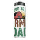 This is a rustic graphic design with a farming theme. The image features a large red barn and a yellow tractor set against a sky with sunburst rays. The phrase "Proud to Be a" is displayed in a semi-circle at the top in a green, weathered font. "FARMER" is a large brown block font and "DAD" is a large green block font below the barn and tractor. The entire design has a bold and proud aesthetic.