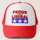 Graphic Red “PROUD to be a LIBERAL text over blue bars with white stars on white background.