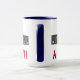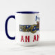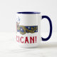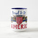 Put your patriotism where your mouth is with this gorgeously designed 15 oz. ceramic coffee mug featuring an ornate banner and shield with golden leaves, red and white stripes, and white on blue stars, sandwiched between the 2-line caption: "Proud To Be An American!". Captions can be personalised at no extra cost. Inside mug is royal blue (no stains!) w/ matching handle.