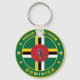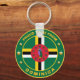 The national flag of Dominica is infused into a circle shape, which itself, is decorated in the flag colours. Aside from the text, there are 6 decorative stars which are acting as dividers.