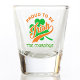 Proud to be Irish shot glass featuring a green shamrock and "Irish" in a retro orange script. Personalise with your name in green Celtic-style typography.