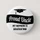 Show the world how proud you are of your nephew or nieces graduation. This proud Uncle button graphic art design includes a black graduation cap, black ribbon with the words "Proud Uncle" and the text My Nephew Is Graduating! . Bottom text can be changed to other personalisation: My Niece Is Graduating!, So Proud of My Nephew, So Proud Of My Neice etc.. Great for all types of graduation ceremonies, parties and events. Perfect for kindergarten, middle school, high school, college, university, uni, grad school,, military academy, trade school, nursing school, law school, dental, school, medical school, and more. Show your pride!