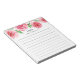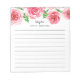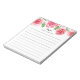 Chic floral notepad features a top border of pink and red watercolor roses and green leaves. Personalise with two lines of custom text in modern block and calligraphy lettering; shown with the French greeting "bonjour" and your name. Lined.