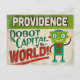 A funny Providence Rhode Island vintage travel postcard featuring a friendly robot with fun retro style text that says, "Providence, Robot Capital of the world!"