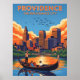 A scenic view of Providence, Rhode Island, featuring a gondola on the water with the city skyline and a sunset in the background.