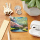 Inspirational quote scripture keychain depicts a beautiful nature watercolor painting with a quiet stream of water lined with pink flowering trees and a blue sky. It features a portion of the beloved and encouraging Bible Verse 'The Lord is my Shepherd', Psalm 23:2-3, "He leads me beside still waters, He restores my soul."