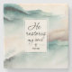Inspirational scripture stone coaster depicts a simple watercolor abstract background in natural shades of blue, tan, black and brown. It features a portion of Bible Verse Psalm 23:4, "He restores my soul."