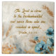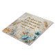 Ceramic tile with inspirational quote scripture depicts a beautiful artistic design with blades of golden wheat and blue flowers on a light grey abstract background. It features an encouraging Bible Verse from Psalm 34:18, "The Lord is close to the brokenhearted and saves those who are crushed in spirit."