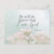 Postcard with inspirational quote Scripture depicts a simple botanical garden with pretty pink flowers and a soft blue background. It features Bible Verse Psalm 46:10, "Be still and know that I am God." The greeting, prayer can be personalised or deleted for a hand written message.