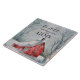 Inspirational quote scripture ceramic tile depicts a simple winter watercolor scene with snow falling on a red house surrounded by trees. It features Bible Verse Psalm 46:10, "Be still and know that I am God."