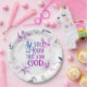 Inspirational scripture paper plate depicts a beautiful watercolor violet garden design with simple flowers and leaves. It features Bible Verse Psalm 46:10 "Be still and know that I am God." *