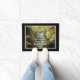 Inspirational quote scripture doormat depicts a stream of water surrounded by trees with beautiful foliage. It features Bible Verse Psalm 8:9, "O Lord, our Lord, how majestic is your name in all the earth!"