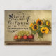 Inspirational quote Thanksgiving postcard depicts a beautiful still life with a vase of sunflowers and bowl of fruit. It features a portion of Bible Verse Psalm 95:2, "Let us come into his presence with thanksgiving."~