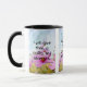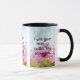 This mug boasts the "Psalms 18:1" KJV bible scripture verse in a bold print font with neon yellow letters plus bible citation over a picture of a pink flowers under a bright blue sky with an up close floral background in this biblical verse and theme from the King James bible. The rim & handle are glazed in matching colours available in 11-ounce or 15-ounce sizes microwave and dishwasher safe ceramic construction.