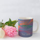 Modern minimalistic abstract lavender pattern coffee mug. Personalised coffee mug. Add a burst of colour to your day with this personalised coffee mug featuring your name in blue green Psychedelic stripes. The minimalist, geometric letter design makes it a unique and thoughtful gift for friends and family.
