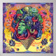 A surreal and vibrant illustration featuring a woman's face. Her hair is adorned with mushrooms, flowers, and other natural elements, while her face is surrounded by swirling patterns, eyes, and bubbles.