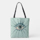 Psychedelic eye tote bag with a weird vector psychedelic illustration of a beautiful abstract eye with strange eyelashes ending in dots in different shades of blue. Great design for a makeup artist and for someone like me who has obsession with eyes. As odd as possible is as good as possible. Accessories with blue eyes are used in some cultures to defend against jealousy and evil thoughts against the wearer. This beautiful design will also appeal to a woman who has a deep interest in mysticism as eyes are a popular symbol for something mystical. Last but not least, you can give it as a gift to a girl who has beautiful blue eyes.
