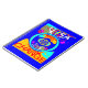 The design is dominated by a bold royal blue background, framed with striking yellow/gold borders. The centre features a kaleidoscopic arrangement of circles and patterns in cyan, red, yellow, and magenta, creating a mesmerising, energetic focal point. Large, stylised text fragments add to the urban, graffiti-like texture of the piece. This piece is a perfect statement for anyone who loves pop art, abstract design, and bold, contrasting colours.