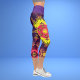 These psychedelic leggings feature bright pink and yellow with deep purple in an asymmetrical kaleidoscope pattern.