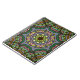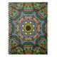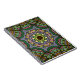 A notebook with a green, blue, and purple kaleidoscope pattern.