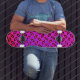A repetitive pattern spreads across a purple & pink psychedelic background on this funky skateboard.