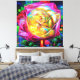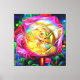 A mesmerising digital painting of a rose bursting with psychedelic energy and rainbow hues. The vivid pink petals wrap around a glowing golden core, creating a surreal floral centerpiece.