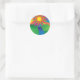The sun rises above mountains with a river flowing through them, all done in neon colours like orange, pink, green, purple and blue on a sticker