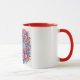 A classic VW bus mug covered in colourful psychedelic patterns, surrounded by swirling energy and vibrant flowers. A retro-inspired travel design full of free-spirited vibes.
