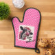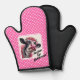 A whimsical and fun oven mitt with a pink and white polka dotted background, a dressed up black and white cow wearing pink glasses, pink dress, and pearls. Lace frame around the cow and the saying, Pucker Up Buttercup! in the corner.